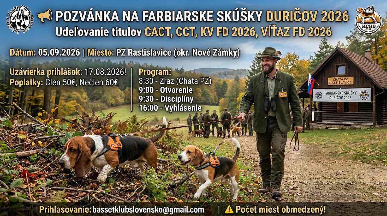 Basset klub Slovenskej republiky v spolupráci s Klubom chovateľov bíglov Slovenska usporiada Farbiarske skúšky duričov s udeľovaním titulu CACT, CCT, KV FD 2026 a víťaz FD 2026.