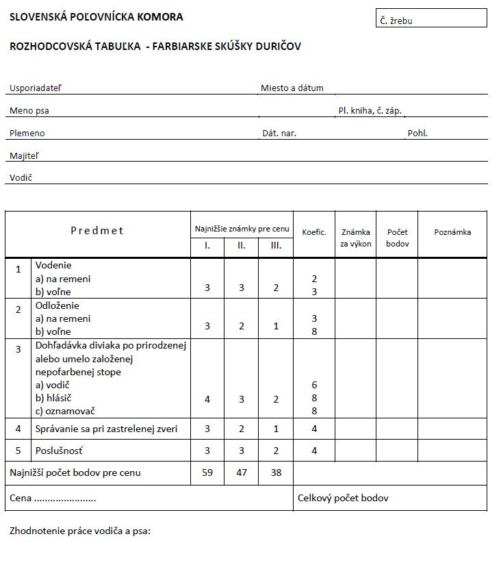 Môžu ich absolvovať všetky plemená duričov, teriérov, sliedičov, jazvečíky a farbiare bez obmedzenia veku a výšky psa v kohútiku. Zisťuje sa na nich schopnosť psa dohľadať poranenú diviačiu zver.
